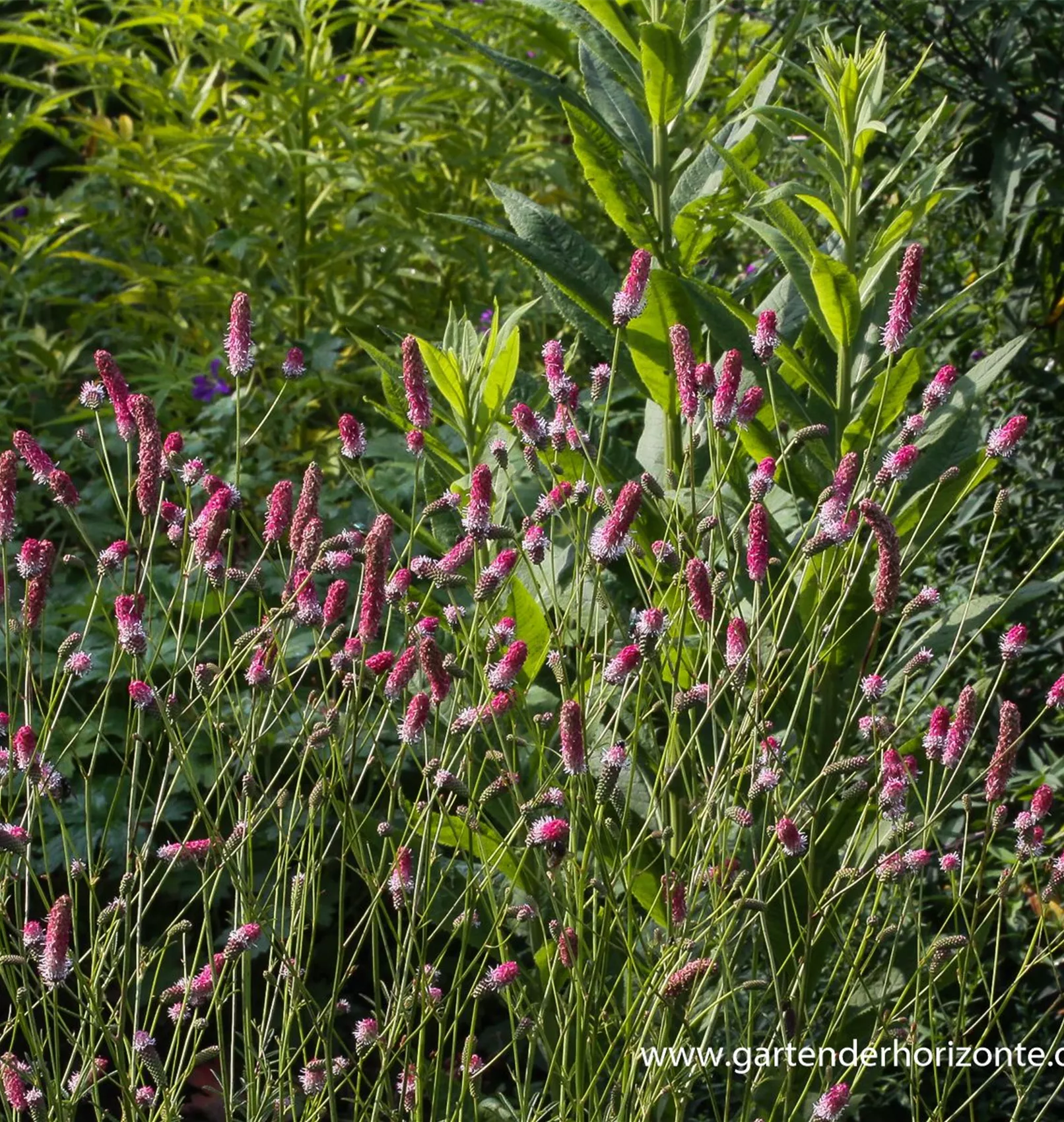 Der Garten-Wiesenknopf 'Pink Tanna' (Sanguisorba officinalis) ist eine aufrechte Staude, die von Juni bis August rosarote, in Ähren angeordnete Blüten bildet. An einem sonnigen bis halbschattigen Standort mit durchlässigem, lockerem, nährstoffreichem Boden erreicht er gewöhnlich eine Höhe von ca. 1,1 m und wird ca. 50 cm breit. Der Garten-Wiesenknopf 'Pink Tanna' ist gut frostverträglich.