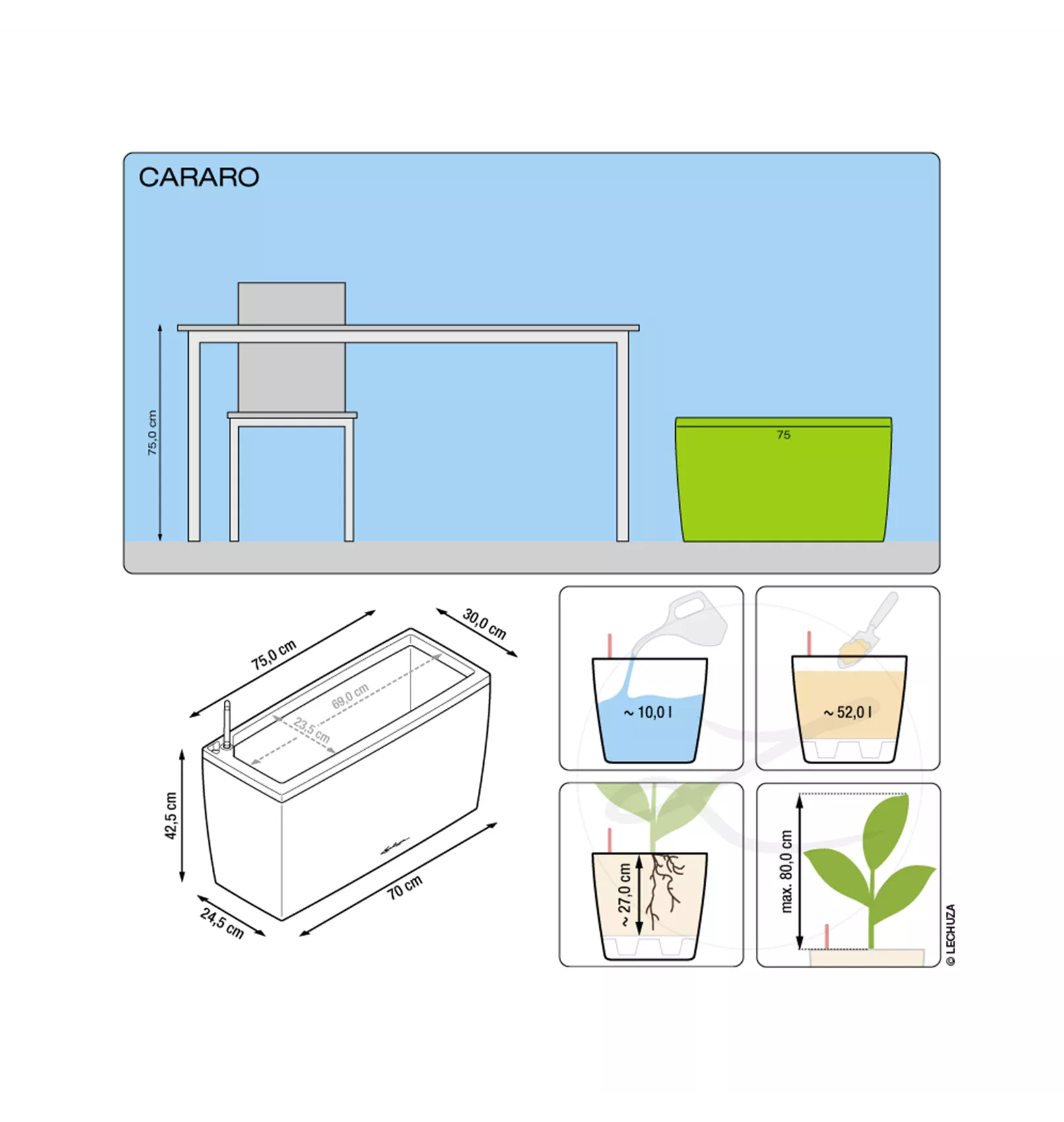 Das längliche Pflanzgefäß CARARO ist optimal als grüner Raumteiler geeignet, der mit dichten, hohen Grünpflanzen bestückt, Räume begrenzt und optisch in einzelne Bereiche gliedert. Dank integrierter Rollen ist das Gefäß auch bepflanzt mobil und ermöglicht eine individuelle und flexible Gestaltung von Wohn- und Geschäftsräumen. Für die optimale Versorgung der Pflanzen sorgt das integrierte Original LECHUZA Bewässerungssystem mit Wasserstandsanzeiger, Wasserreservoir und Pflanzsubstrat.