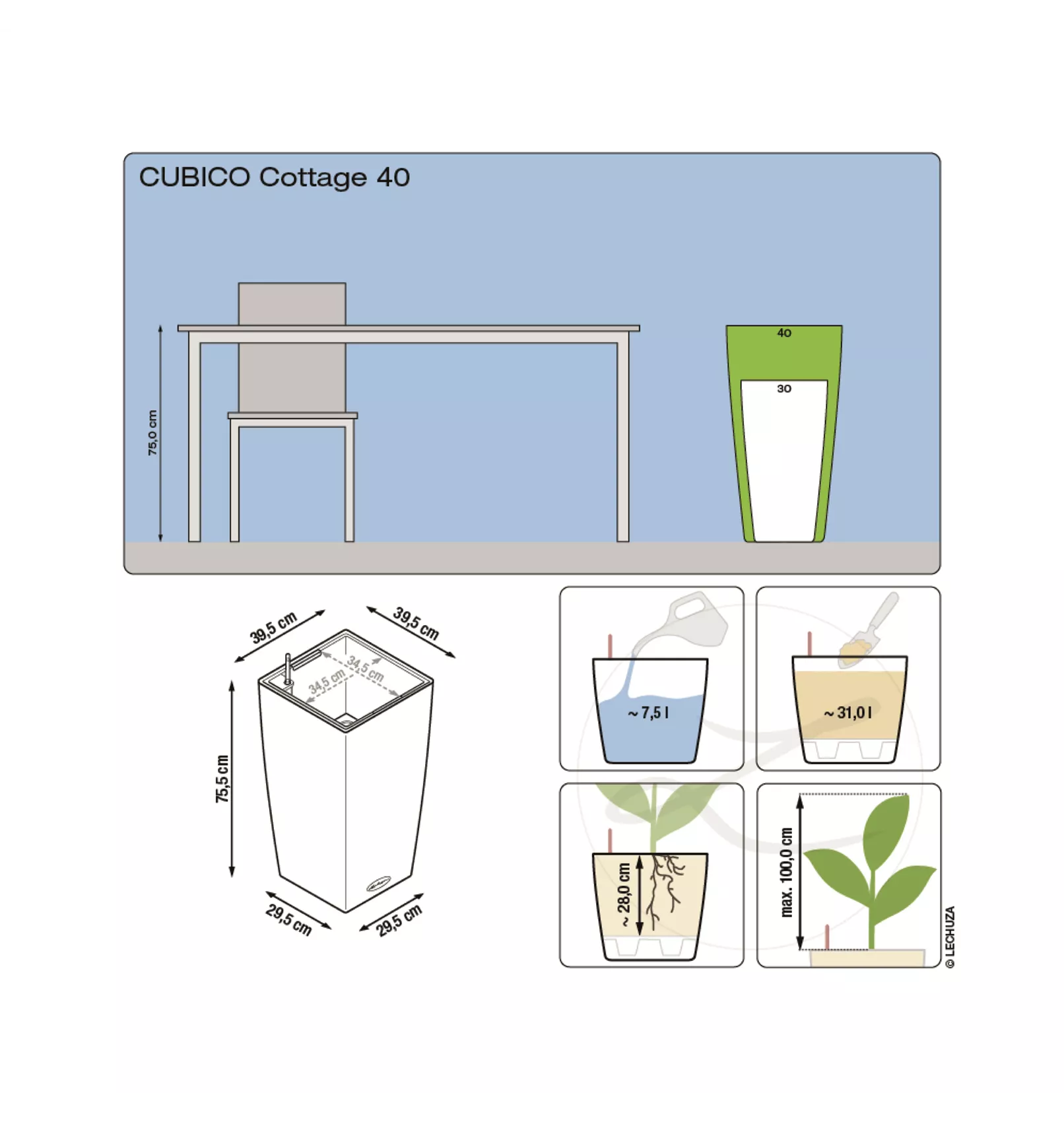 Die feine Flechtstruktur der Gefäße aus der Cottage-Collection bietet vielfältige Einsatzmöglichkeiten auf der Terrasse oder im Garten. Mit dem Original LECHUZA Bewässerungssystem, dem herausnehmbaren Pflanzeinsatz,der integrierten Überlauffunktion und den robusten Oberflächen sind die Gefäße der Cottage Collection ideale Partner für die Gartensaison im Outdoor-Bereich. Die farbneutralen, herausnehmbaren Pflanzeinsätze können mit allen CUBICO-Modellen in derselben Größe ausgetauscht werden.