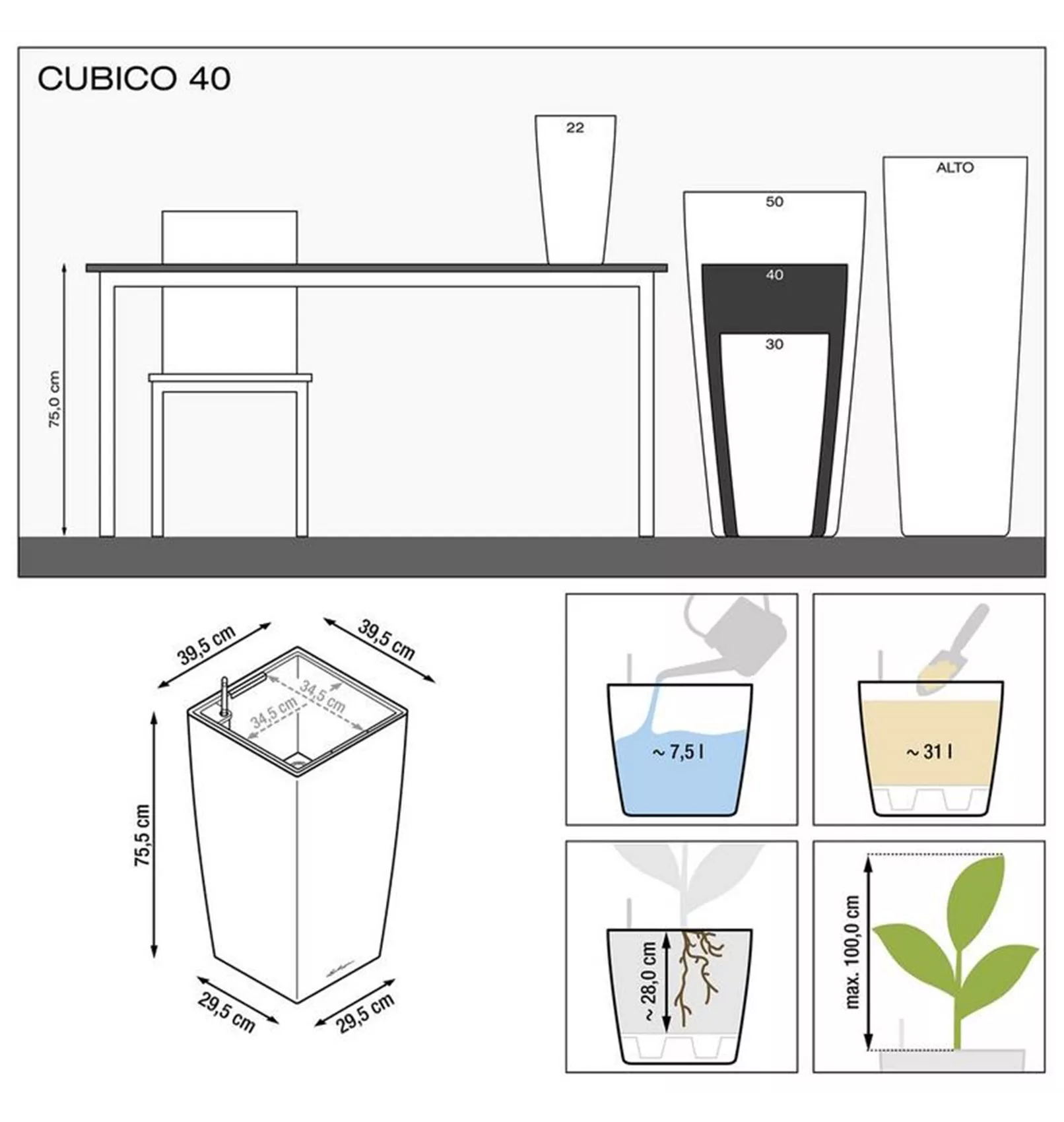 Die farbneutralen, herausnehmbaren Pflanzeinsätze können mit allen CUBICO-Modellen in derselben Größe ausgetauscht werden. Mit dem passenden Rolluntersetzer für CUBICO 30 und CUBICO 40 bleiben die Pflanzenarrangements stets mobil.