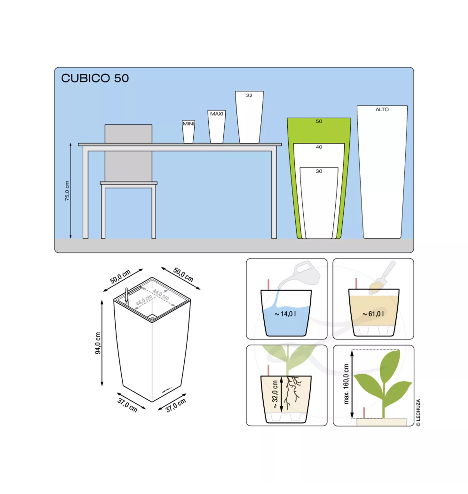 Der LECHUZA-Klassiker! Die elegante Säule ist bereits seit 2003 Bestandteil des LECHUZA-Sortiments und erfreut sich ungebrochener Beliebtheit. CUBICO kann in zahlreichen Größen und Farben inszeniert werden – dezent in einem Arrangement aus mehreren Gefäßen oder solitär als Deko-Highlight. Auch Mehrfachbepflanzungen finden in der edlen Säule einen stilvollen Rahmen.