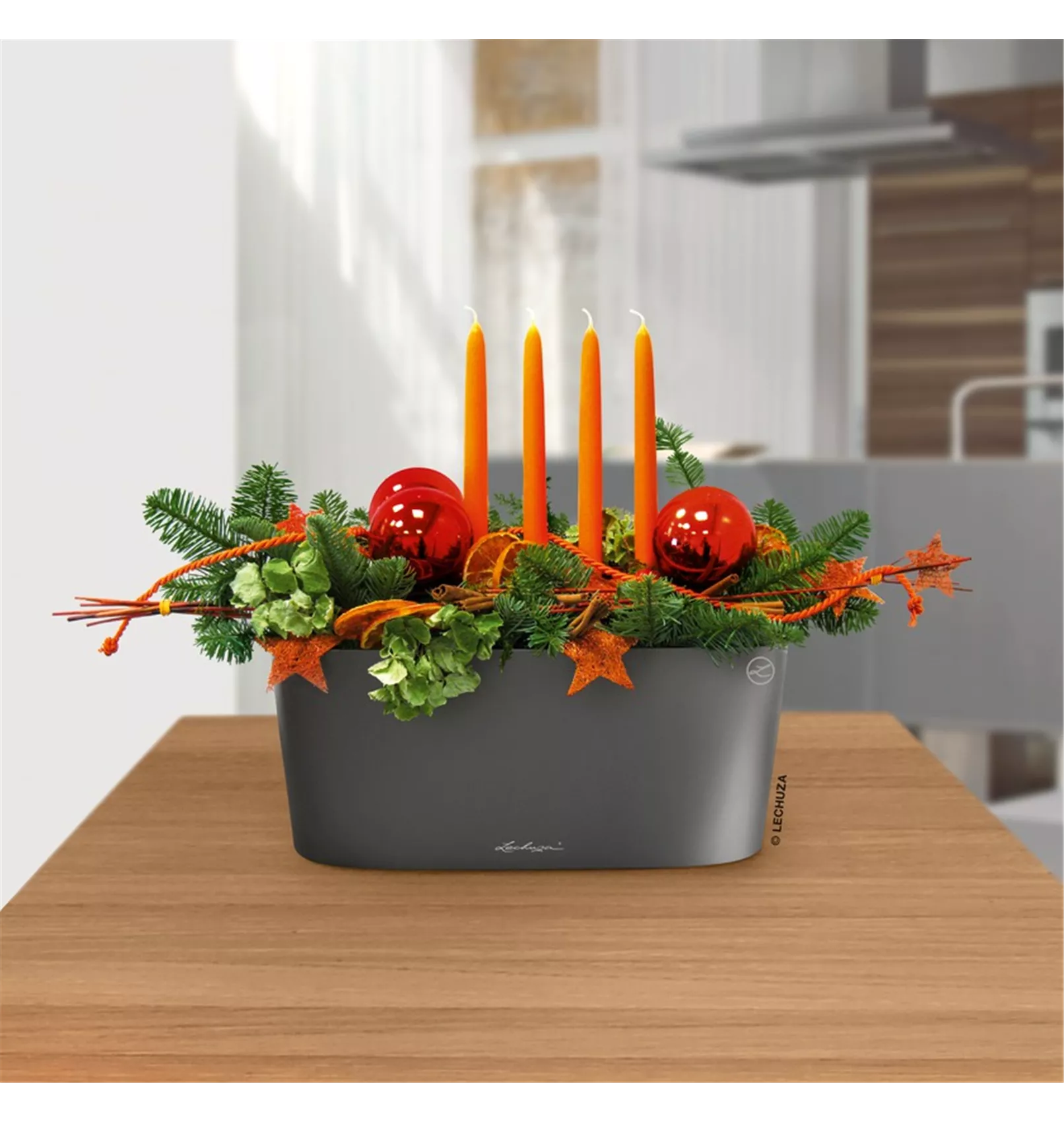 Dank des Pflanzeinsatzes in Gefäßfarbe ist die Bepflanzung schnell und mühelos gewechselt und kann für saisonale Anlässe blitzschnell umgestaltet werden.