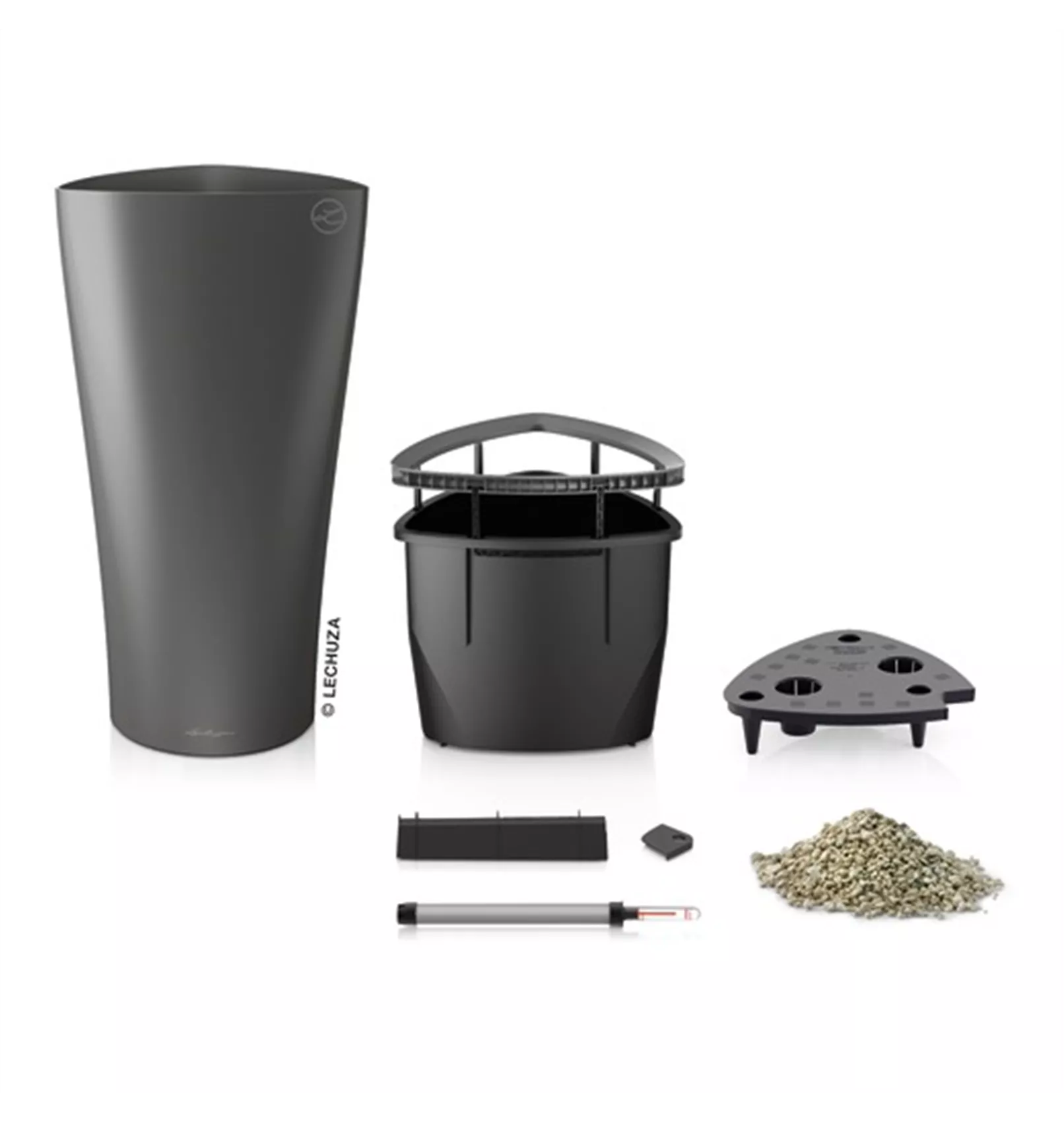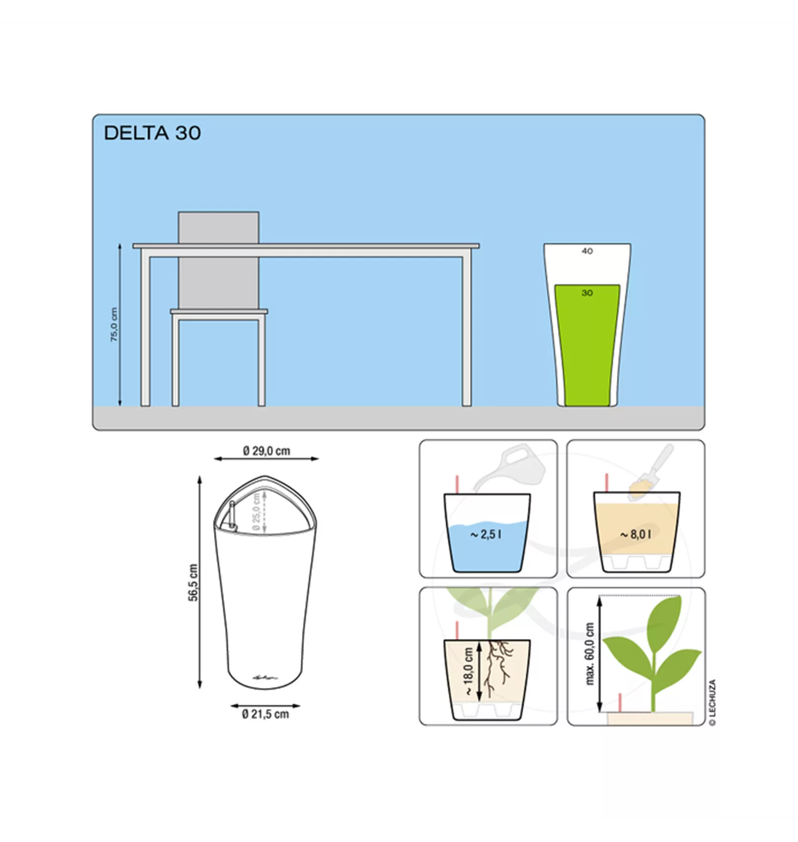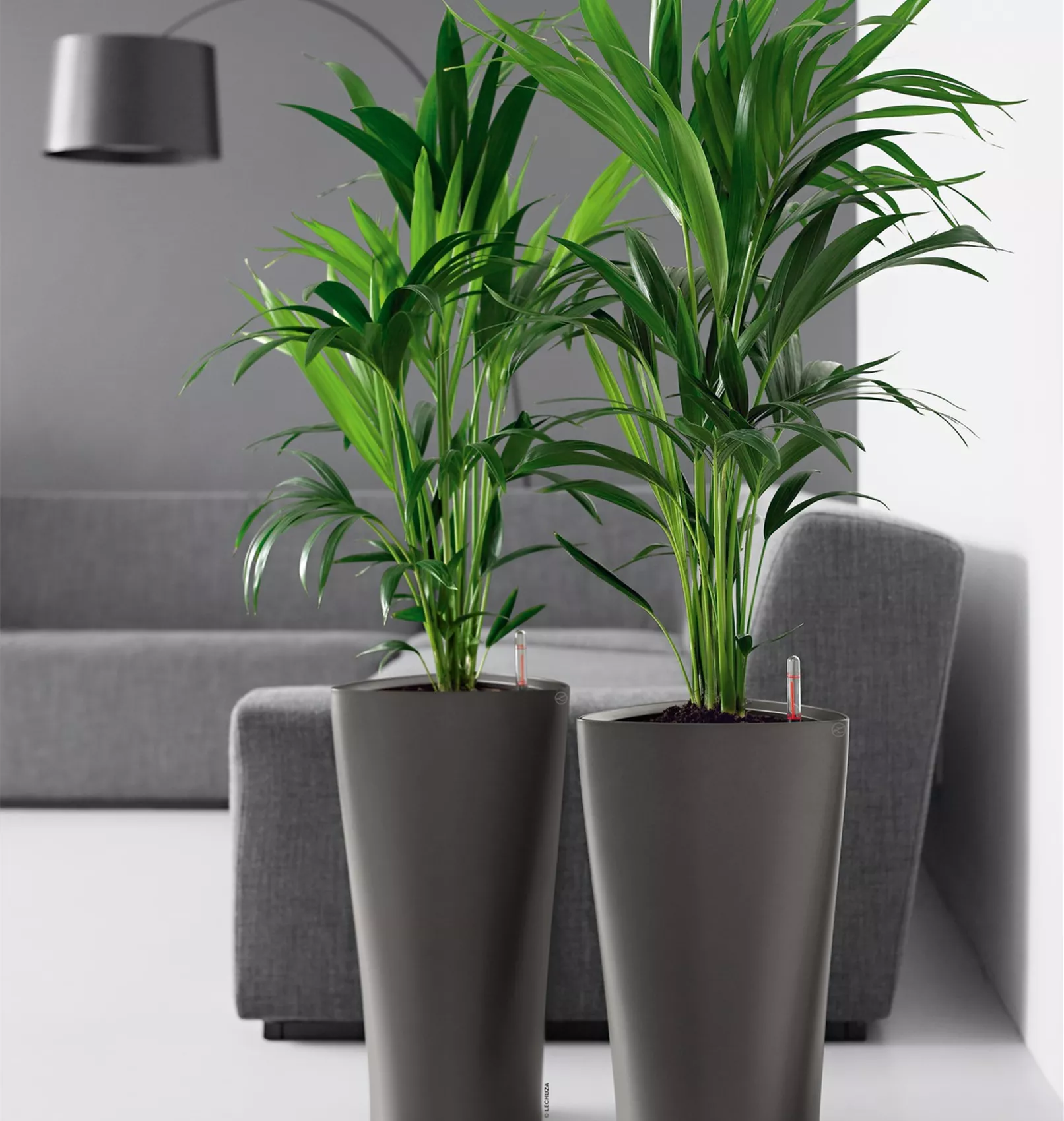 Das schmale Pflanzgefäß DELTA setzt mit der außergewöhnlichen Form hohe Grünpflanzen oder zarte Orchideen elegant und eindrucksvoll in Szene. Die runde Säulenform schließt oben in einem elegant geschwungenen Dreieck ab und setzt so aufmerksamkeitsstarke Akzente. Ob im Wohnzimmer, im Büro oder in öffentlichen Räumen – DELTA 30 und 40 bieten in drei Farbtönen einen außergewöhnlichen Rahmen für Bepflanzungen jeglicher Art. Der Pflanzeinsatz mit dem Griffrahmen in der Gefäßfarbe ermöglicht ein einfaches Wechseln der Bepflanzung und das integrierte Original LECHUZA-Bewässerungssystem versorgt die Pflanzen optimal.