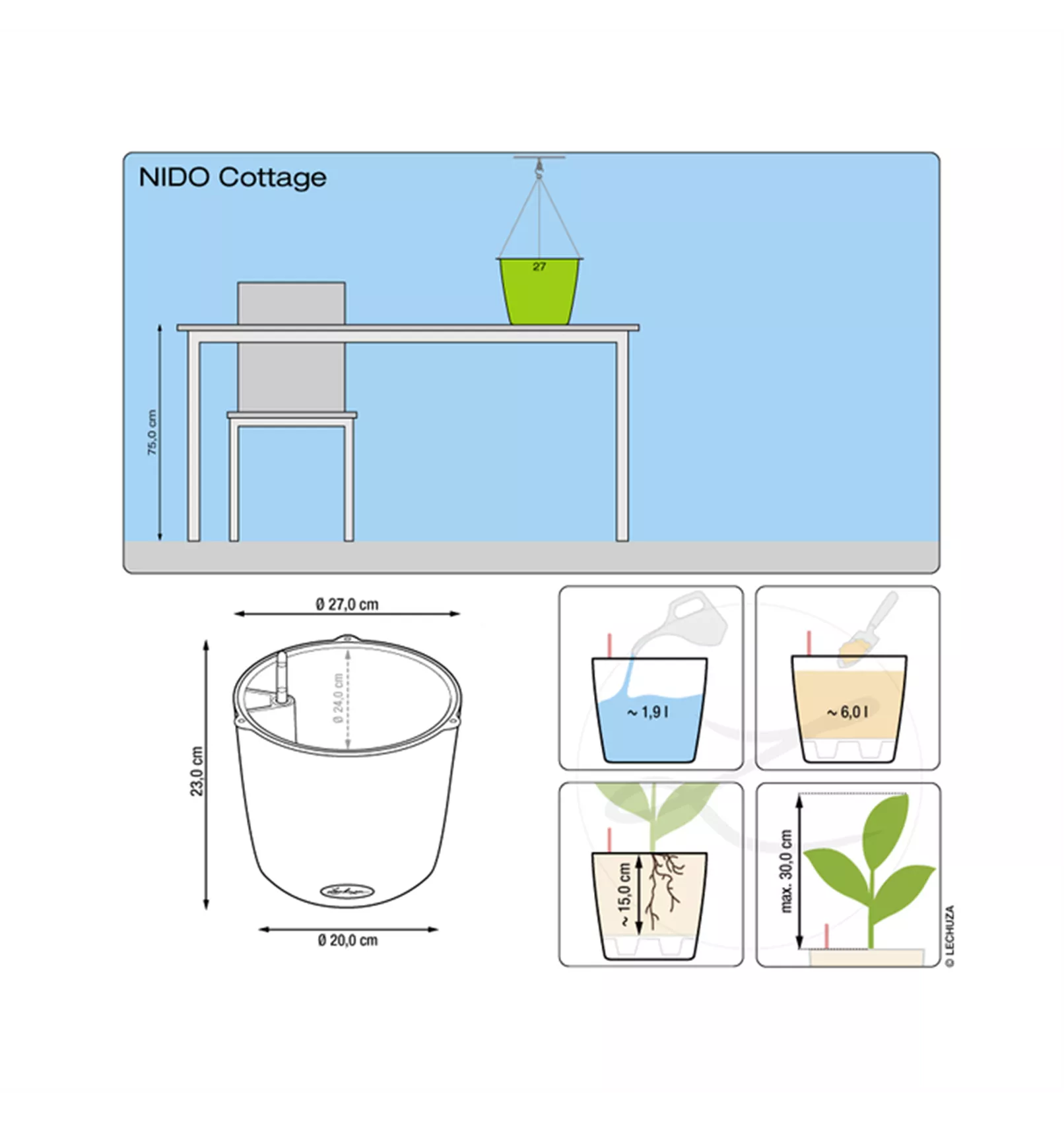 Das Pflanzgefäß NIDO Cottage, die Hängeampel von LECHUZA, eignet sich perfekt, um Kräuter oder Blühpflanzen auch in luftiger Höhe in Szene zu setzen. Die enthaltene Edelstahlaufhängung verleiht dem Gefäß Stabilität und trägt die sommerliche Blumenpracht besonders sicher. Alternativ kann das Gefäß NIDO dank des geraden Bodens auch als Tischgefäß verwendet werden.
