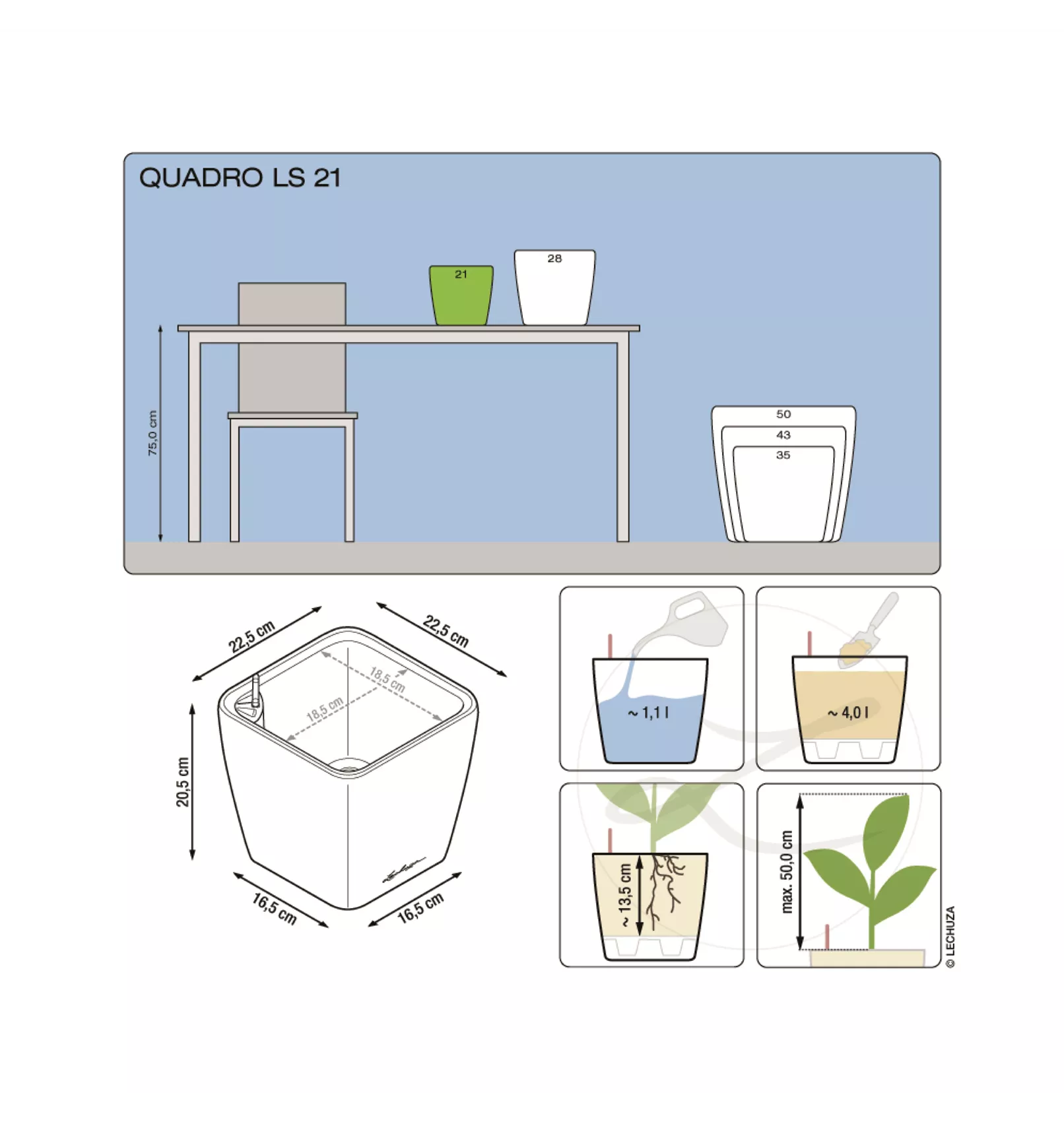 Ein bewährter Design-Klassiker im LECHUZA-Sortiment ist QUADRO Premium LS. Das edle Pflanzgefäß ist in fünf Größen und insgesamt sieben Hochglanz- und Metallic-Farben erhältlich und passt mit dem zeitlosen puristischen Design zu jedem Wohnstil. Ob mit großen Grünpflanzen im Wohnzimmer oder mit Orchideen bestückt im Büro, QUADRO Premium setzt alle Pflanzen gekonnt und stilvoll in Szene. Dank integriertem Original LECHUZA-Bewässerungssystem werden die Pflanzen optimal versorgt. Durch den herausnehmbaren Pflanzeinsatz mit versenkbaren Griffrahmen ist das Austauschen der Bepflanzung einfach möglich.